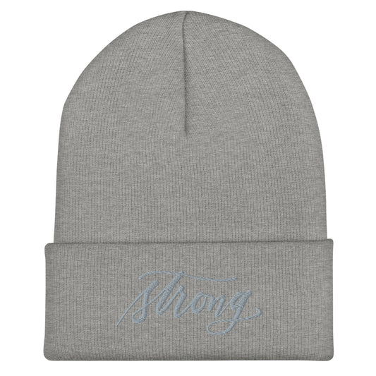 Embroidered Grey Script "Strong" Calligraphy on Grey Cuffed Beanie